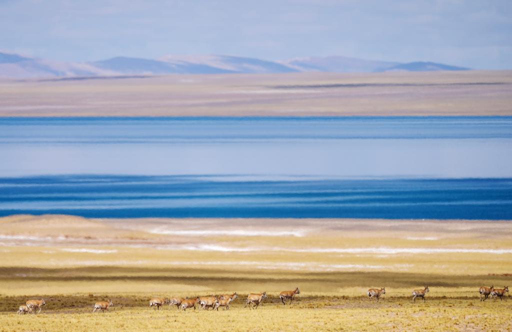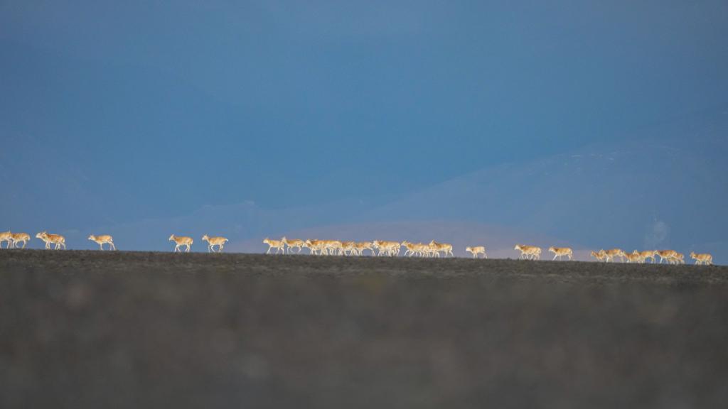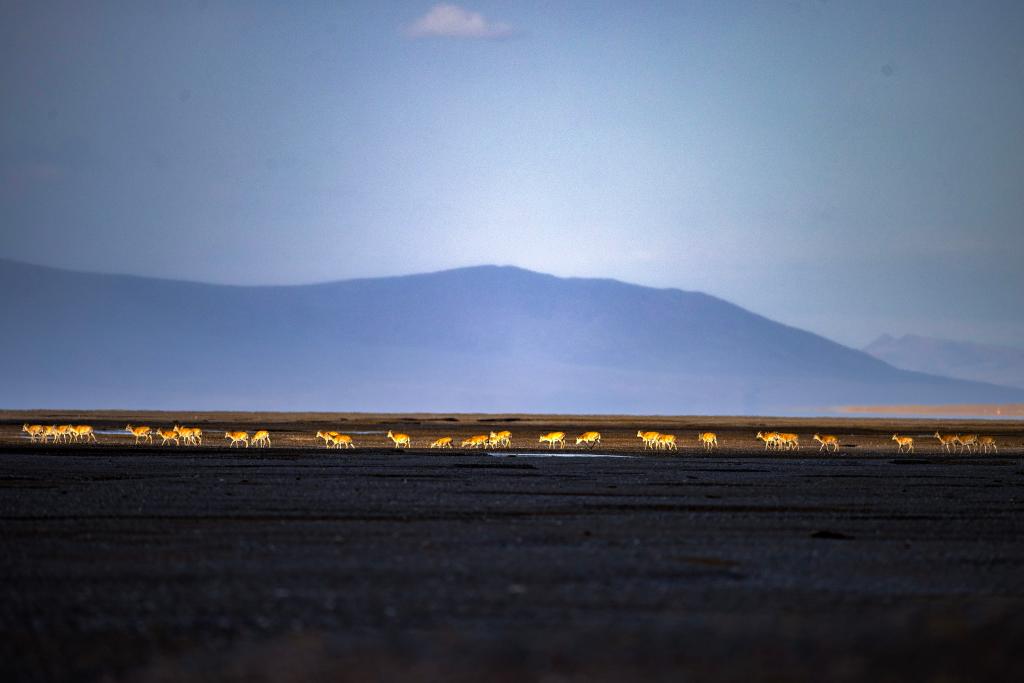 6月13日傍晚在羌塘國(guó)家級(jí)自然保護(hù)區(qū)拍攝的遷徙中的藏羚羊。