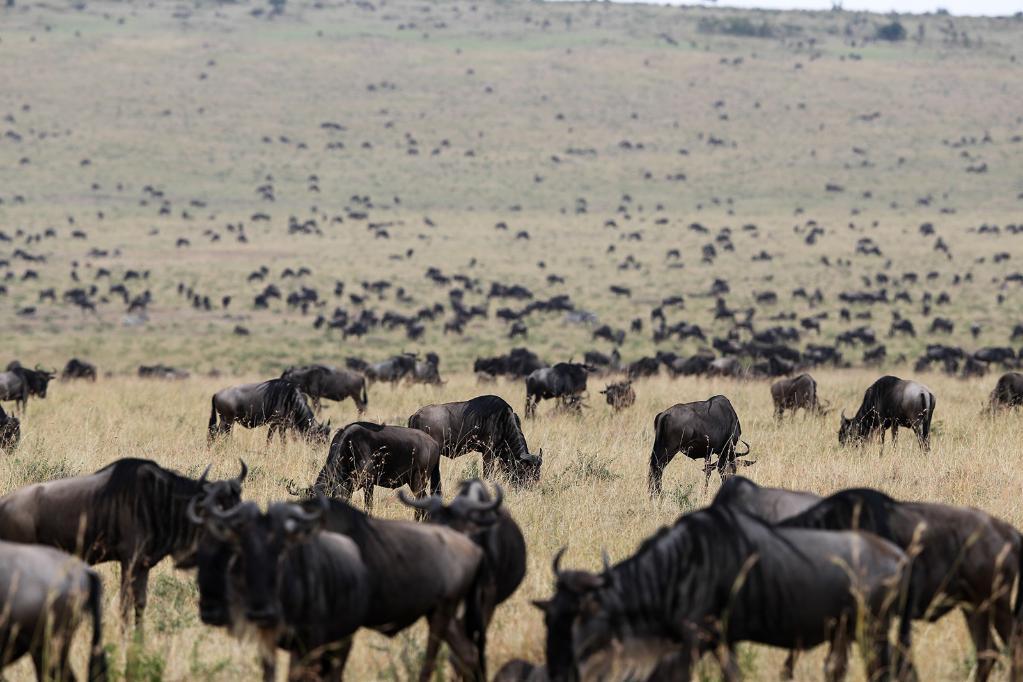 在肯尼亞馬賽馬拉國家公園內(nèi),遷徙中的角馬在草原上覓食。
