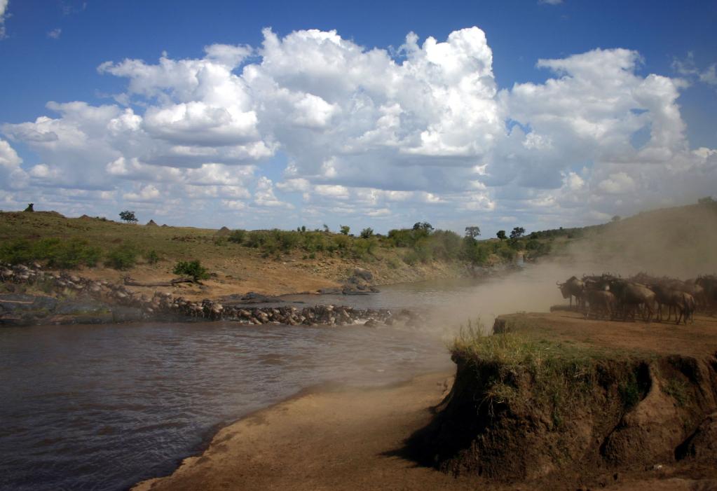 在馬賽馬拉國家保護(hù)區(qū),遷徙中的角馬越過馬拉河。馬拉河“生死之渡”是整個大遷徙過程中最為壯觀和驚心動魄的一幕。