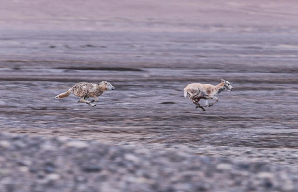 在羌塘國家級自然保護(hù)區(qū),一只野狼正在捕食遷徙中的母藏羚羊。在藏羚羊的遷徙過程中,野狼、雪豹、藏馬熊和藏野狐等掠食動物守候在遷徙路上,隨時準(zhǔn)備捕食。
