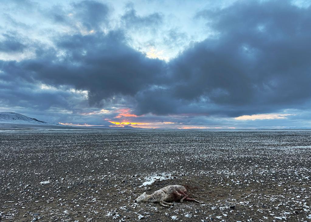 在羌塘國家級自然保護(hù)區(qū),一只被野狼咬死的母藏羚羊躺在雪后的草原上。
