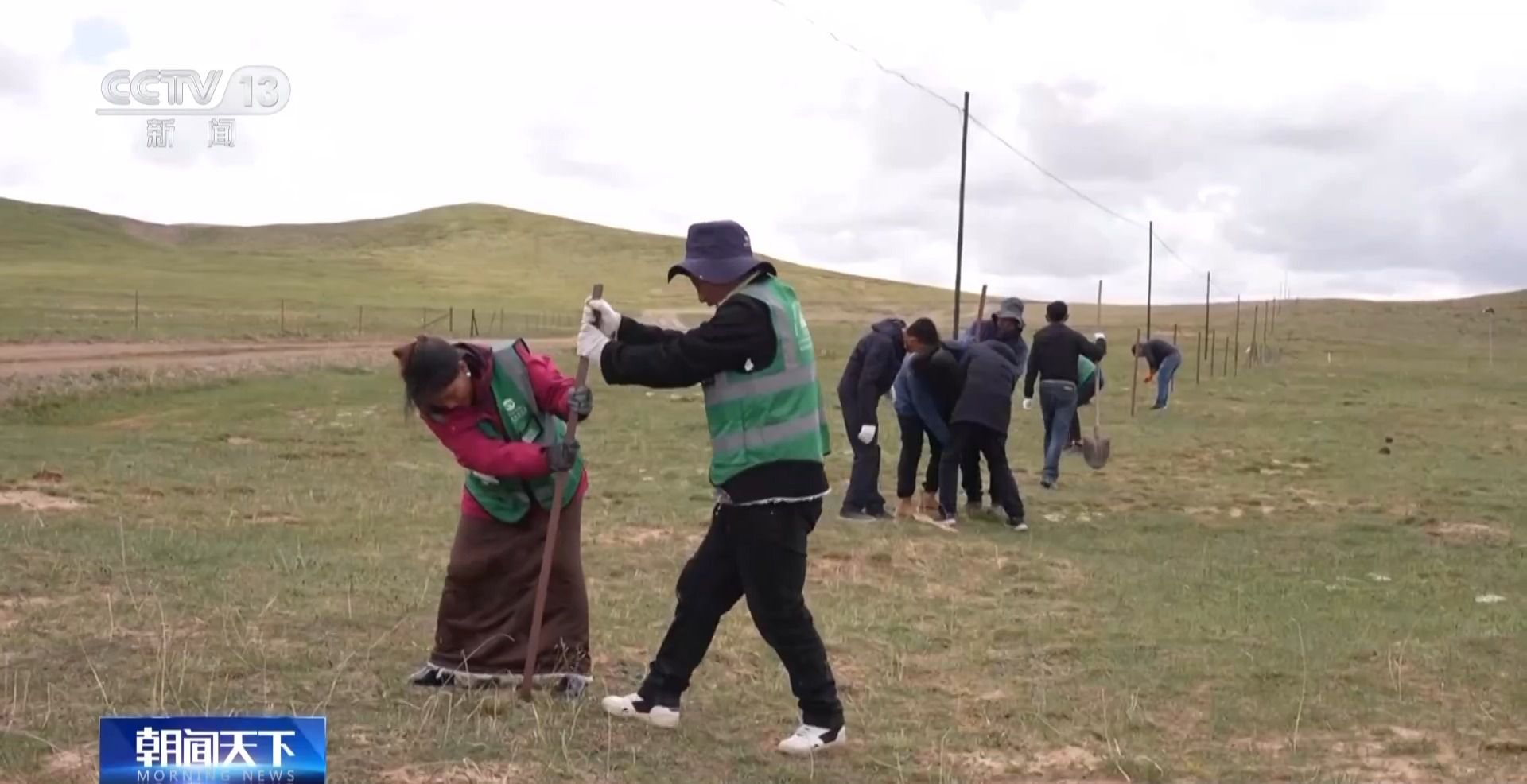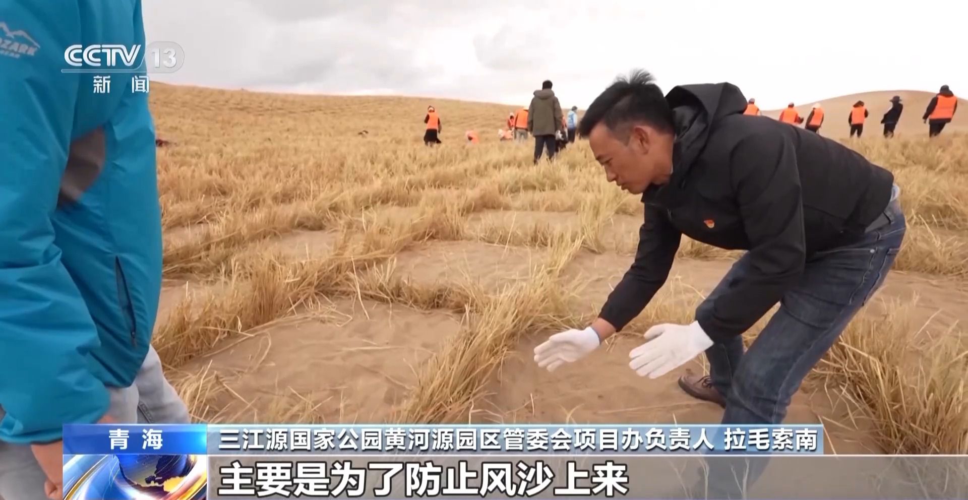 三江源國家公園黃河源園區(qū)管委會項(xiàng)目辦負(fù)責(zé)人 拉毛索南:草方格整體打好以后,把草籽灑在這些中間里面,它就主要是為了防止風(fēng)沙上來,把草籽埋得更深。