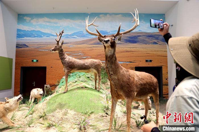 7月24日,參加“中國(guó)式現(xiàn)代化的萬(wàn)千氣象·網(wǎng)絡(luò)名人青海行”活動(dòng)的網(wǎng)絡(luò)名人,抵達(dá)江河源頭青海玉樹(shù)藏族自治州,在玉樹(shù)州博物館一覽自然與人文之美。玉樹(shù)州博物館是玉樹(shù)地震災(zāi)后重建十大標(biāo)志性建筑之一,分為序廳、自然展區(qū)、人文展區(qū)、臨時(shí)展廳。其通過(guò)實(shí)物標(biāo)本等方式,展示了三江源和可可西里的野生動(dòng)物、草地、森林,以及玉樹(shù)州的歷史、建筑、服飾、飲食等。圖為玉樹(shù)州博物館內(nèi)的野生動(dòng)物展示。中新社記者 張?zhí)砀?攝