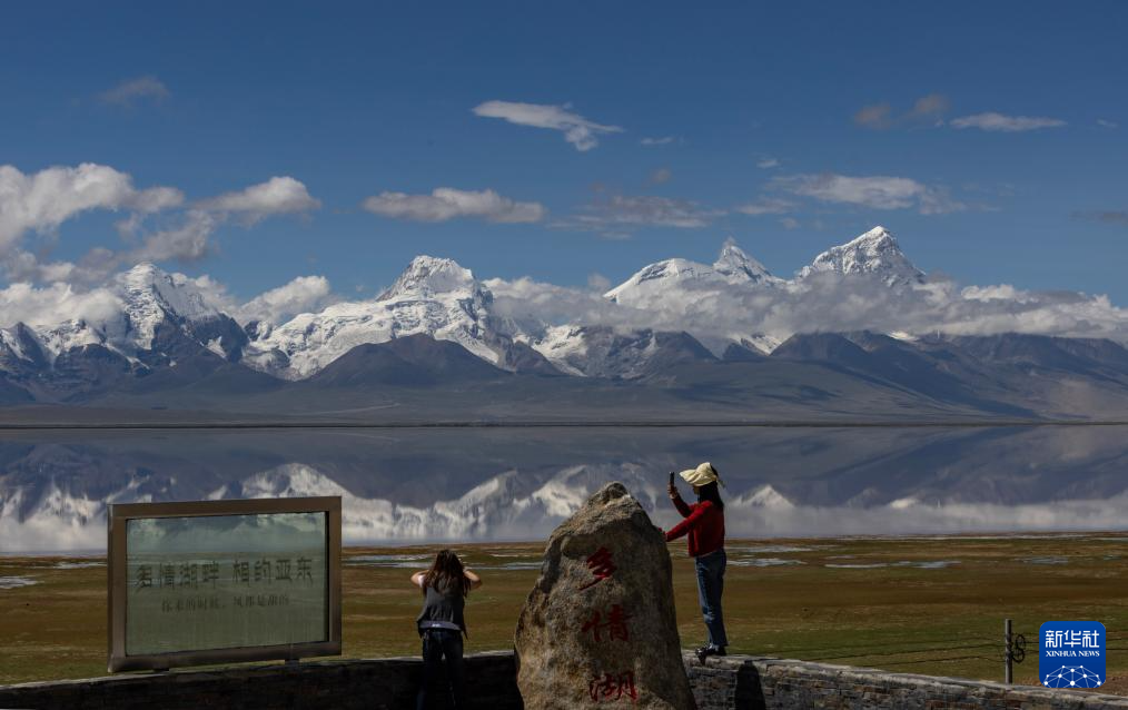 8月1日,游人在多慶錯國家濕地公園拍攝卓木拉日雪山。新華社記者 姜帆 攝