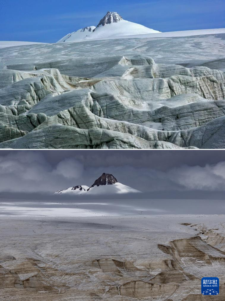 拼版照片:上圖為2009年6月拍攝的普若崗日主峰(新華社發(fā) 車(chē)剛攝);下圖為2024年9月4日拍攝的普若崗日主峰(新華社記者姜帆攝)。對(duì)比可以看出普若崗日主峰下的冰原消融嚴(yán)重。新華社發(fā)