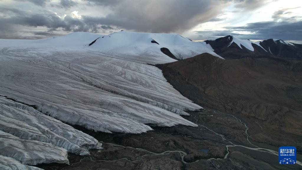 這是9月4日拍攝的普若崗日冰原8號(hào)冰川、消融形成的徑流以及遠(yuǎn)處的令戈錯(cuò)(無(wú)人機(jī)拼接照片)。新華社記者 姜帆 攝