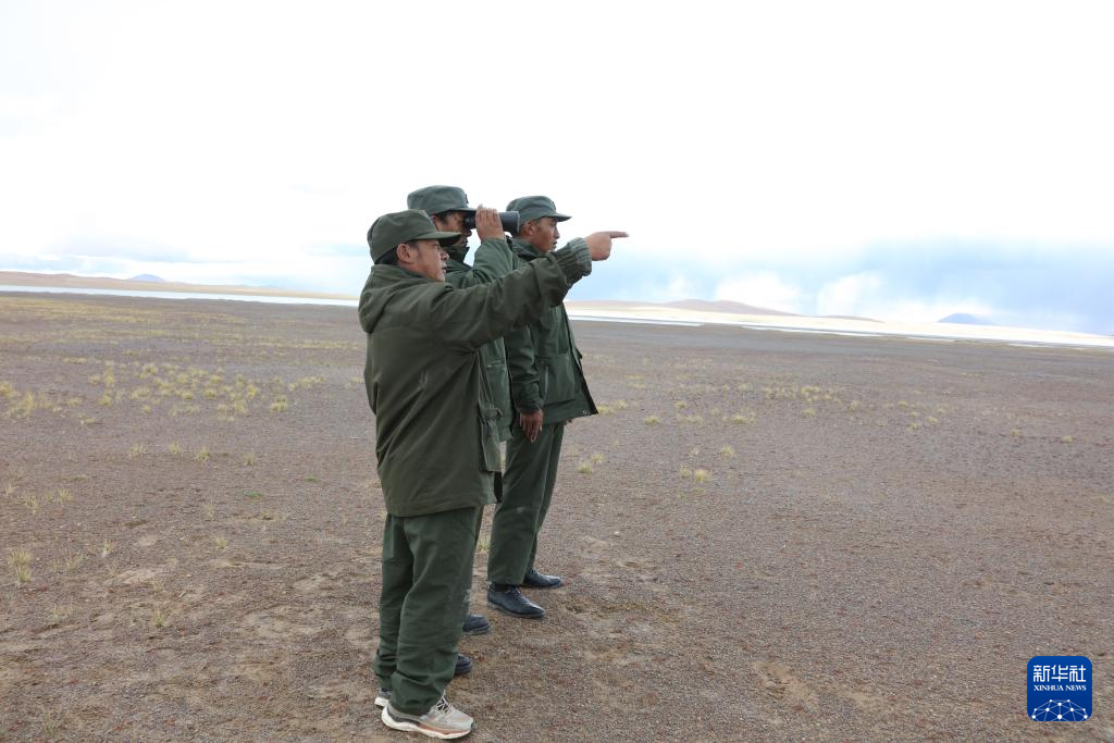 野生動(dòng)物專(zhuān)業(yè)管護(hù)隊(duì)員在令戈錯(cuò)旁巡護(hù)(9月8日攝)。新華社記者 劉詩(shī)平 攝