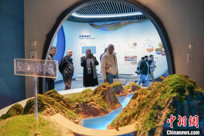 圖為代表團成員在青海省自然資源博物館內通過模型了解青海省水資源。中新社記者 馬銘言 攝