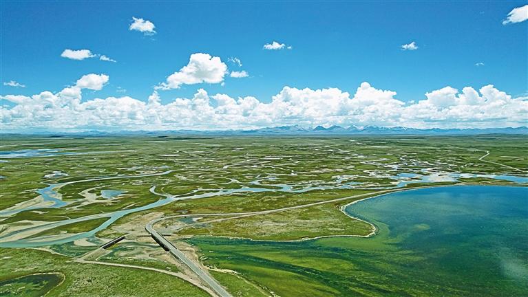 圖為三江源國(guó)家公園唐北區(qū)域聶榮片區(qū)尼日阿錯(cuò)改湖濕地鳥瞰圖。記者 萬(wàn)靖 攝