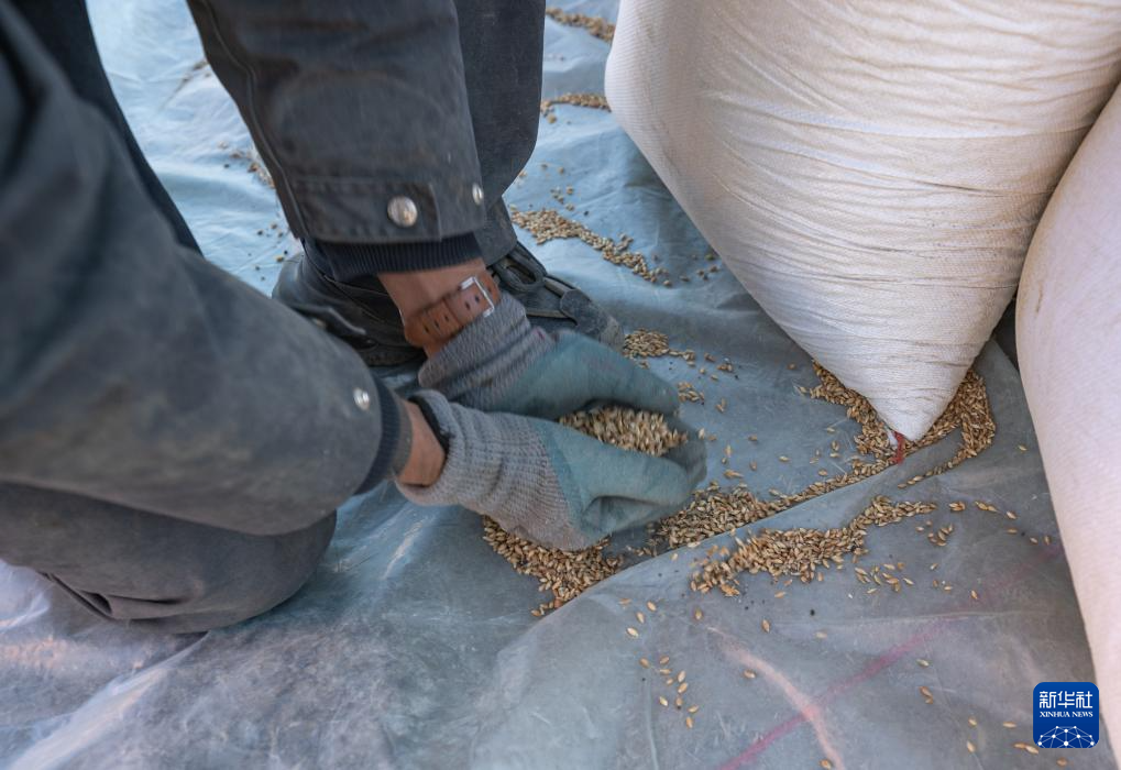 1月13日,在定日縣長所鄉(xiāng)古榮村,定日縣民兵在搬運(yùn)青稞。新華社記者 丁增尼達(dá) 攝