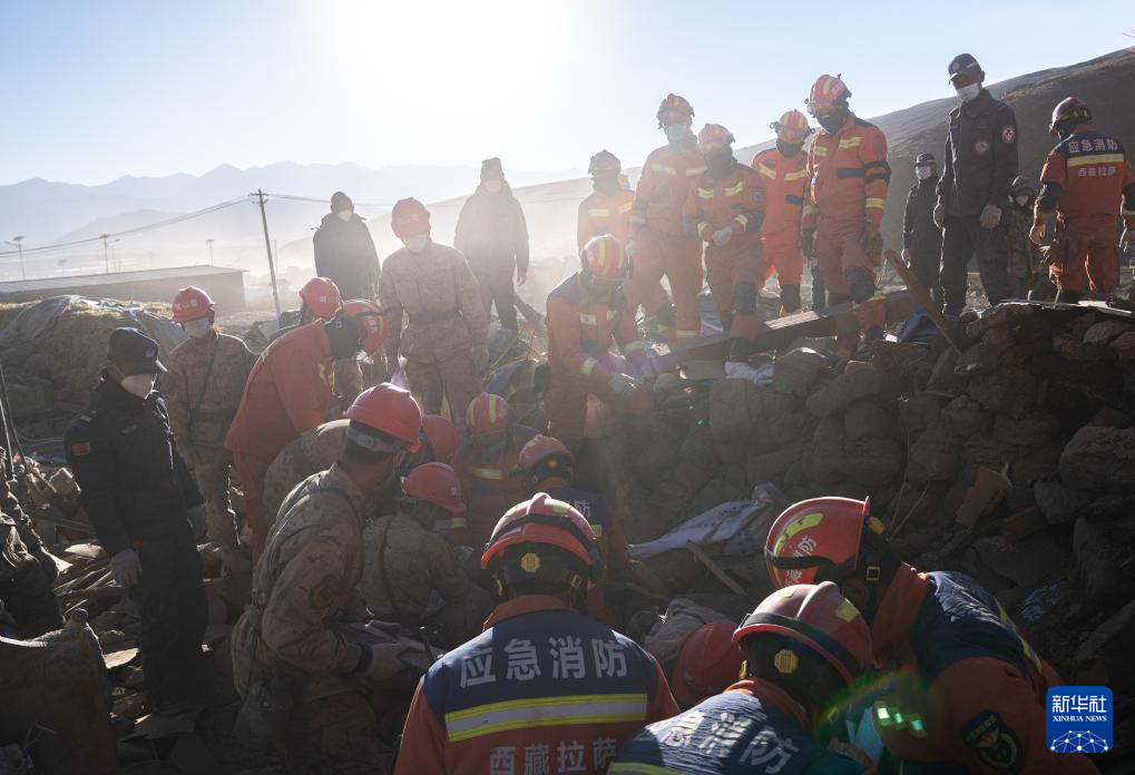 1月13日,在定日縣長所鄉(xiāng)古榮村,消防員們在搬運(yùn)從次仁扎西老人家里搶救出的青稞。新華社記者 丁增尼達(dá) 攝