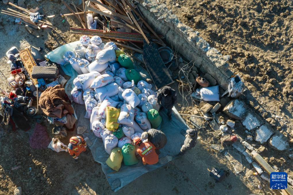 1月13日,在定日縣長所鄉(xiāng)古榮村,搶救出的70多袋青稞堆放在角落(無人機(jī)照片)。新華社記者 丁增尼達(dá) 攝
