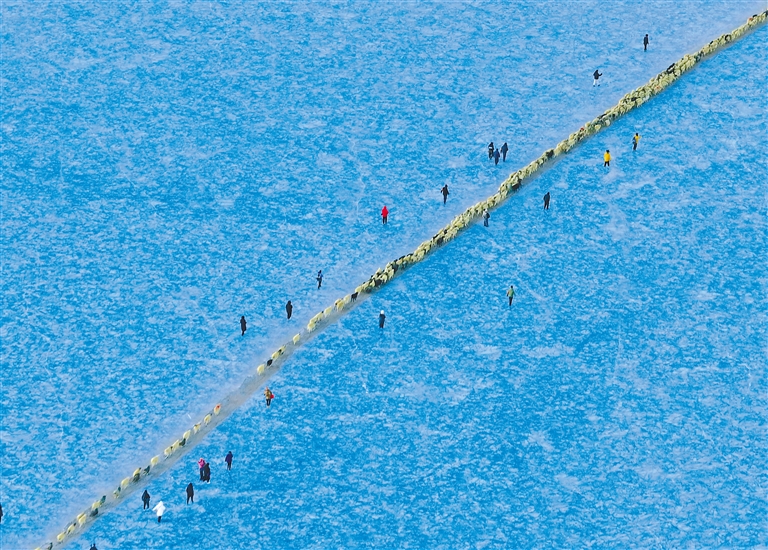 清晨,當(dāng)?shù)谝豢|陽(yáng)光灑在冰面上,牧民便開(kāi)始了他們的旅程。穿著傳統(tǒng)服飾的老爺爺帶頭驅(qū)趕著羊群踏上冰面。羊群沿著爐灰鋪成的小路緩緩前行,宛如一條長(zhǎng)長(zhǎng)的金色線條,在藍(lán)冰上勾勒出一幅亮麗畫(huà)卷。途中,偶爾會(huì)有小羊因冰面濕滑而摔倒,牧民總是及時(shí)將它們扶起,或背或抱地送到島上。