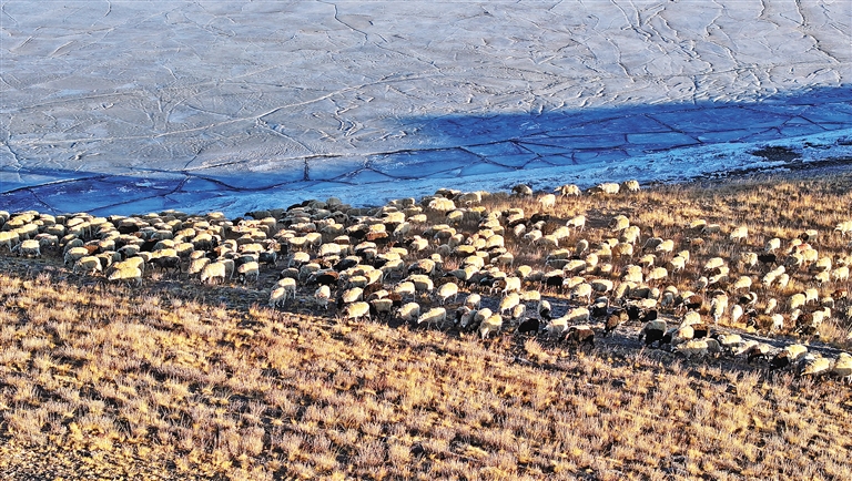 當(dāng)羊群踏上湖心島的那一刻,仿佛整個(gè)世界都安靜了下來(lái)。羊群悠閑地吃著草,享受著冬日的陽(yáng)光。