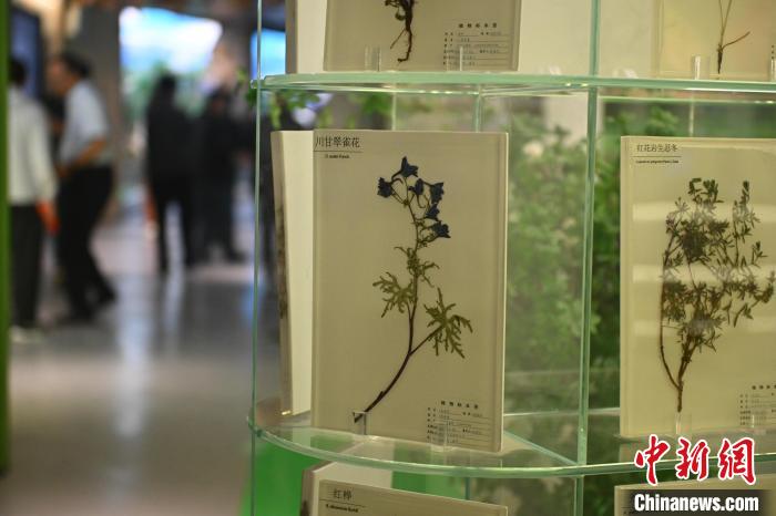 6月16日,在位于甘肅省張掖市肅南裕固族自治縣的祁連山國家公園自然博物館展陳的川甘翠雀花標本與紅花巖生忍冬標本。中新社記者 李亞龍 攝