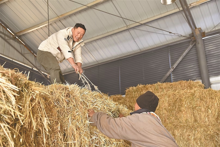 圖為熱達(dá)與同事整理冬儲(chǔ)飼草。青海日?qǐng)?bào)記者 余暉 攝
