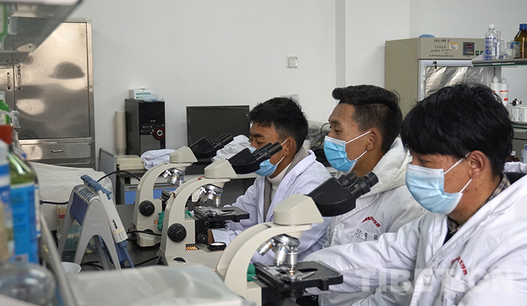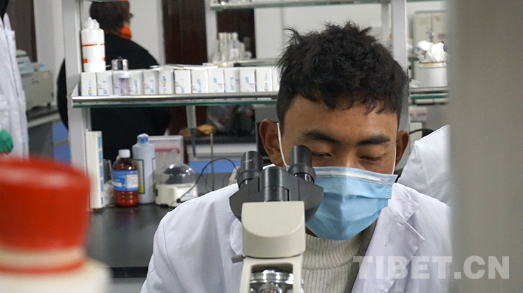 圖為4月9日返校后,次仁多吉(左一)在實驗室做實驗 攝影:王媛媛