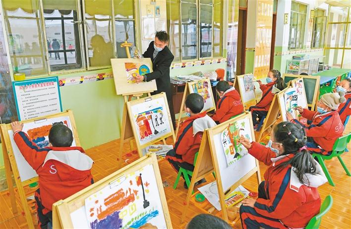 圖為買巴鄉(xiāng)小學(xué)學(xué)生正在課堂上以繪畫的方式表達(dá)對(duì)偉大祖國(guó)的熱愛之情。記者 唐斌 次旺 攝
