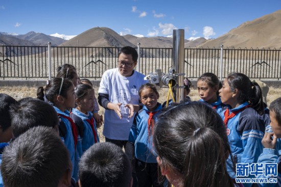 5月23日,工作人員為參加“公眾科學日”活動的學生介紹珠峰站內(nèi)的科研設備。新華社記者 普布扎西 攝
