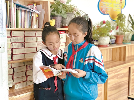 圖為課外時(shí)間,貢吉(左)與好朋友分享閱讀過(guò)程中看到的經(jīng)典語(yǔ)句。 拉薩融媒記者 靳敏攝