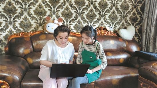 圖為閑暇時(shí)間,次仁白珍(右)和媽媽一起看舞蹈視頻,研究舞蹈動(dòng)作。 拉薩融媒記者 余洋洋攝