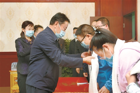 9月10日上午,區(qū)黨委常委、拉薩市委書記白瑪旺堆看望慰問離退休和辛勤工作在教育一線的教師代表,并通過他們向全市廣大教師和教育工作者致以節(jié)日的祝賀和誠摯的問候。圖為在拉薩市北京中學(xué),白瑪旺堆為教師代表一一獻(xiàn)上哈達(dá)。 拉薩融媒記者 平措旺堆攝