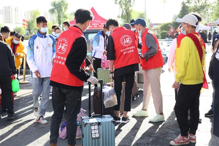 在西藏大學(xué)各學(xué)院的服務(wù)點前,新生在志愿者的幫助下進行口罩替換、行李消毒、體溫測量、入校審批表核驗等工作,核驗無誤后,由志愿者幫忙運送行李前往宿舍樓。
