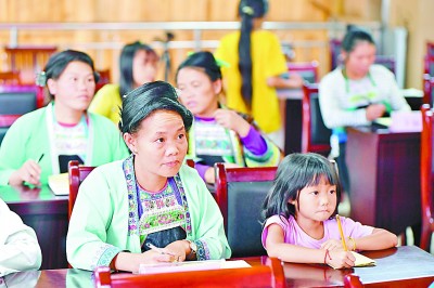9月12日,在桂黔交界的大苗山深處,代時英和女兒在烏英苗寨“雙語雙向”培訓(xùn)班聽課。新華社發(fā)