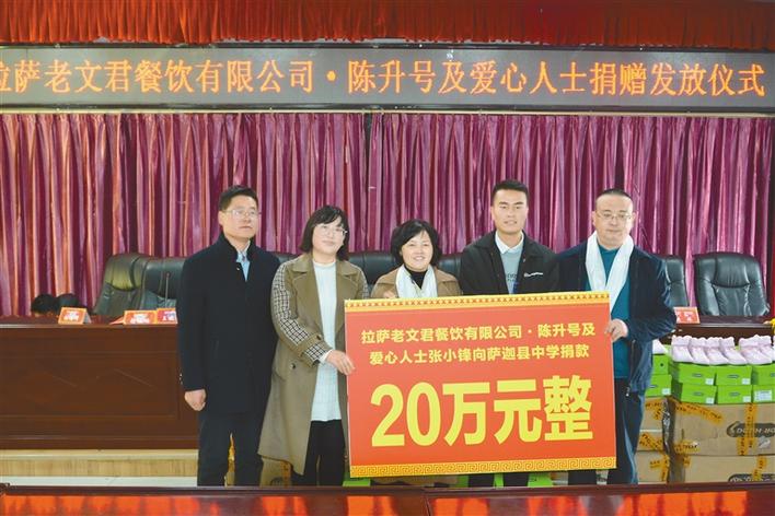 10月28日,拉薩老文君餐飲有限公司·陳升號及相關(guān)愛心人士向西藏日喀則薩迦縣中學(xué)捐贈(zèng)405雙價(jià)值68445元的運(yùn)動(dòng)鞋,并達(dá)成20萬元捐款意向,用于薩迦中學(xué)教育發(fā)展。