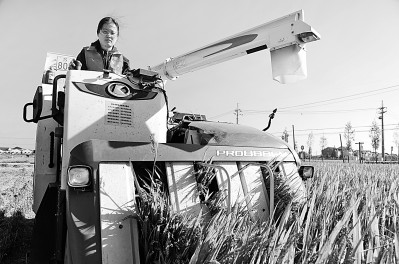江蘇省太倉(cāng)市璜涇鎮(zhèn)雅豐農(nóng)場(chǎng),農(nóng)業(yè)委培大學(xué)生范盈丹駕駛收割機(jī)在稻田間收割水稻。計(jì)海新攝/光明圖片