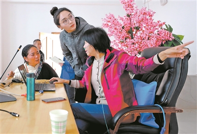 培訓(xùn)過(guò)程中,授課專家、中國(guó)教育科學(xué)研究院教師發(fā)展研究所副所長(zhǎng)卿素蘭博士(右一)由于高原反應(yīng),身體出現(xiàn)不適,桑丁卓瑪臨時(shí)客串起“助教”,幫助調(diào)試教學(xué)設(shè)備、進(jìn)行范文朗讀等。