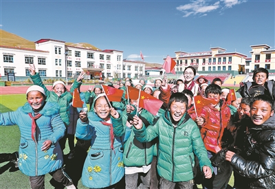 和學(xué)生們?cè)谝黄?,是桑丁卓瑪最開心的時(shí)刻。她專門給學(xué)生帶來(lái)國(guó)旗、國(guó)旗貼,為他們講述國(guó)旗下民族團(tuán)結(jié)好故事。