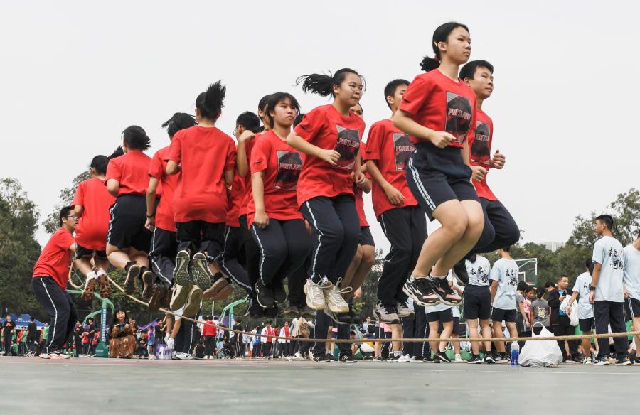 11月26日, 廣西大學(xué)附屬中學(xué)初中年級(jí)學(xué)生在集體跳繩比賽中。新華社記者張愛林?jǐn)z