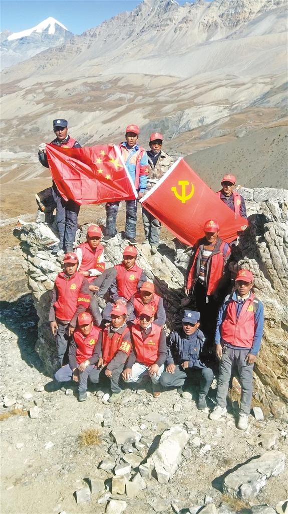 圖為吉隆縣貢當(dāng)鄉(xiāng)樟村黨員先鋒隊(duì)在通外山口巡邏過程中與國(guó)旗、黨旗合影。索朗瓊珠 次仁片多 攝
