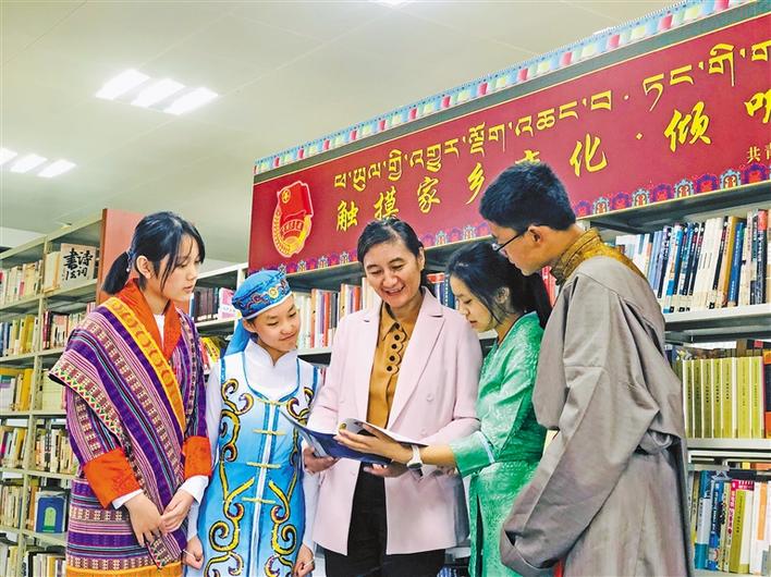 共青團(tuán)西藏自治區(qū)委員會(huì)副書記格桑卓瑪(中),在武漢西藏中學(xué)設(shè)立的“觸摸家鄉(xiāng)變化·傾聽黨的聲音”主題書刊欄處向?qū)W生們介紹相關(guān)書籍。