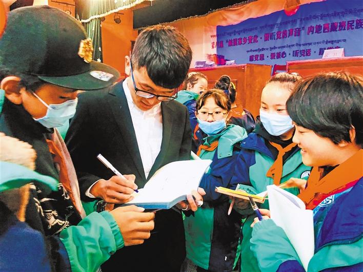 宣講活動(dòng)過程中,共青團(tuán)西藏自治區(qū)委員會(huì)副書記格桑卓瑪、西藏青年報(bào)社副社長(zhǎng)洛桑頓珠給6所學(xué)校內(nèi)地西藏班的學(xué)生們贈(zèng)送了《西藏青年報(bào)》《西藏青年》等刊物和書籍。格桑卓瑪語(yǔ)重心長(zhǎng)地囑咐孩子們:“作為新時(shí)代的新青年,要時(shí)刻牢記時(shí)代賦予的新使命,要用新時(shí)代的標(biāo)尺審視自己,用科學(xué)文化武裝自己,淡化宗教消極影響,在新征程的熔爐中鍛造自己,努力使自己成為堪當(dāng)民族復(fù)興大任的新青年,在全面建設(shè)社會(huì)主義現(xiàn)代化國(guó)家新征程中貢獻(xiàn)自己的青春力量,做神圣國(guó)土的守護(hù)者、幸福家園的建設(shè)者,在青春的閃光中踐行‘感黨恩、愛核心、聽黨話、跟黨走’的家國(guó)情懷?!?/p>