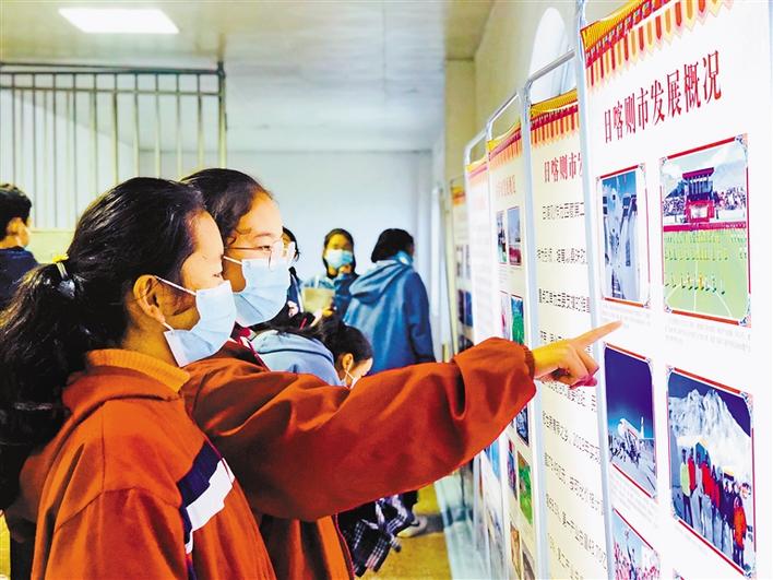 宣講組一行通過圖片和文字資料,向內(nèi)地西藏班的學(xué)子們展示了西藏翻天覆地的變化及各項(xiàng)事業(yè)取得的成就。圖為內(nèi)地西藏班學(xué)生觀看圖片和文字展。