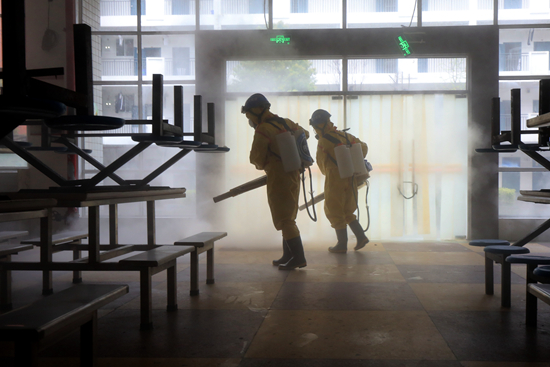 2020年3月22日,湖南省長沙市明德啟南中學(xué),消殺防疫隊員在食堂進行例行消毒。陳澤泉/攝