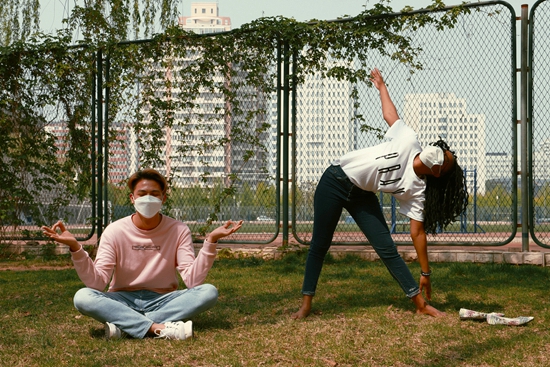 2020年4月14日,北京,對外經(jīng)濟貿(mào)易大學(xué)的來華留學(xué)生在戶外鍛煉。李享/攝
