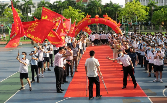 2020年7月6日,廣西南寧市第三十三中學(xué),一名拄著拐杖的高考生在老師同學(xué)的鼓勵下走向“得勝門”。當日,該校舉辦高考“出征”儀式,祝福學(xué)生高考取得勝利。區(qū)明慶/攝