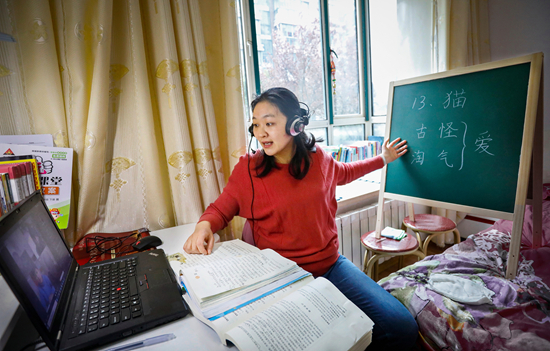2020年3月25日,江蘇省連云港市,一名小學(xué)語文教師在家中給學(xué)生線上授課。受疫情影響,學(xué)校提倡 “停課不停學(xué)”,號召學(xué)生在家上課。張曉青/攝
