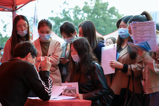 2020年10月24日,湖北省武漢市,華中師范大學(xué)武漢部屬高校聯(lián)合招聘會上,畢業(yè)生與用人單位交流。唐麗香/攝