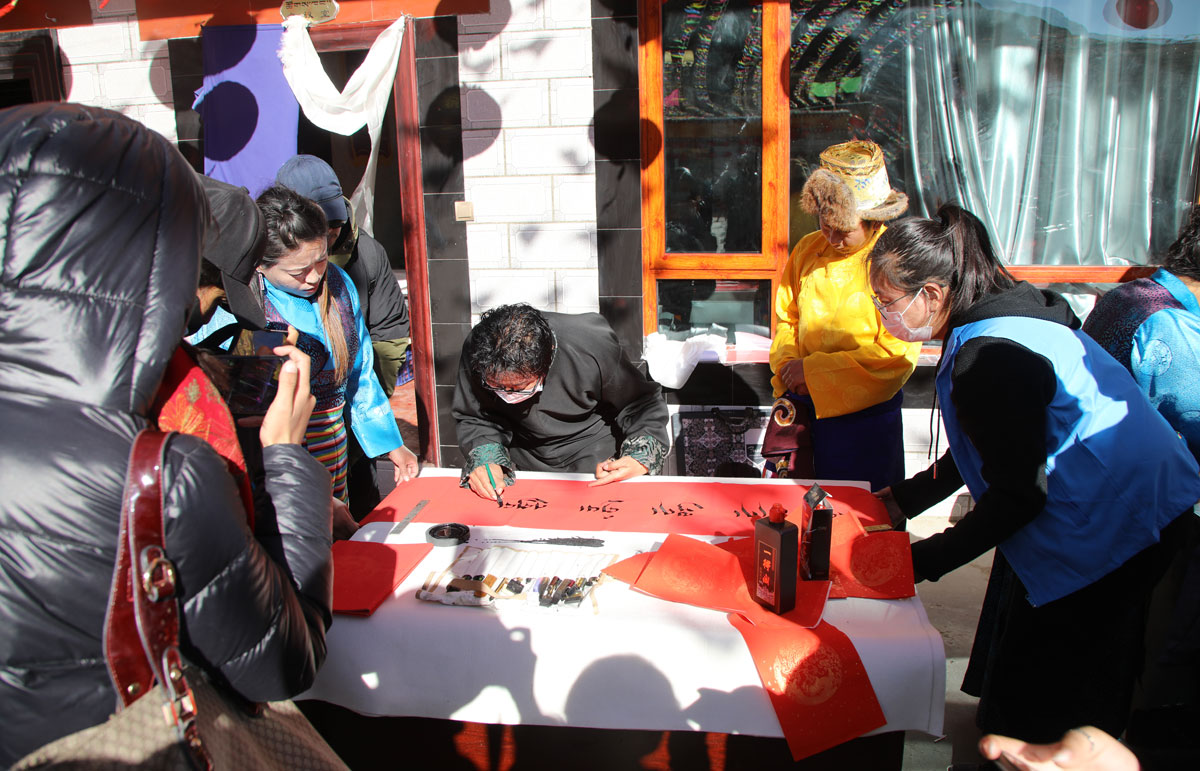 西藏自治區(qū)書協(xié)副主席、拉薩市書協(xié)副主席南杰旺扎說(shuō):“值此新春佳節(jié)和藏歷新年來(lái)臨之際,拉薩市文聯(lián)書法家協(xié)會(huì)組織了三位老師來(lái)到吉蘇村開(kāi)展送書法活動(dòng),一是宣傳黨的好政策,二是雙節(jié)臨近給基層干部群眾送上節(jié)日的祝福。”
