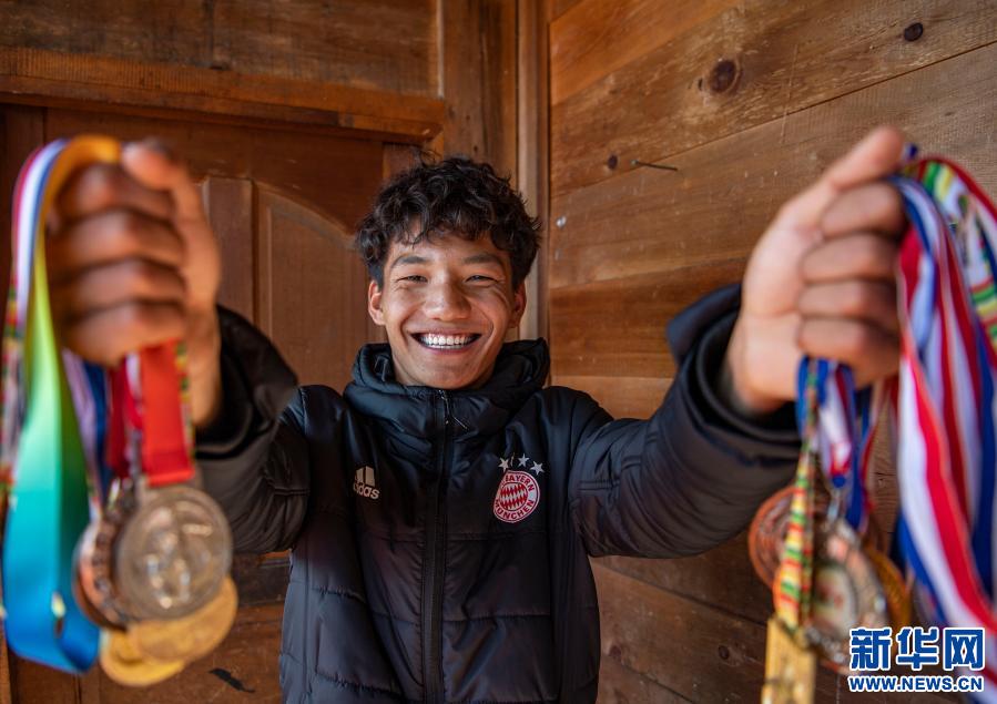 在位于西藏林芝市墨脫縣德興鄉(xiāng)巴登則村的家中,旺前羅布展示自己獲得的獎(jiǎng)牌(2月9日攝)。新華社記者 孫非 攝