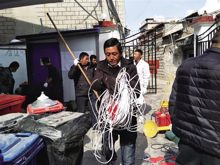 扎西頓珠清理社區(qū)角落堆放的雜物。
