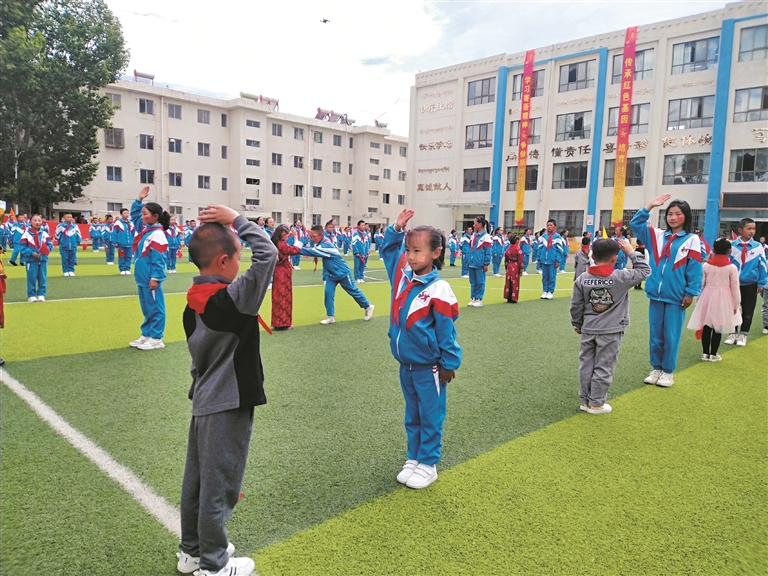 圖為老少先隊員和新少先隊員互敬隊禮。 拉薩融媒記者 莫瑞英攝