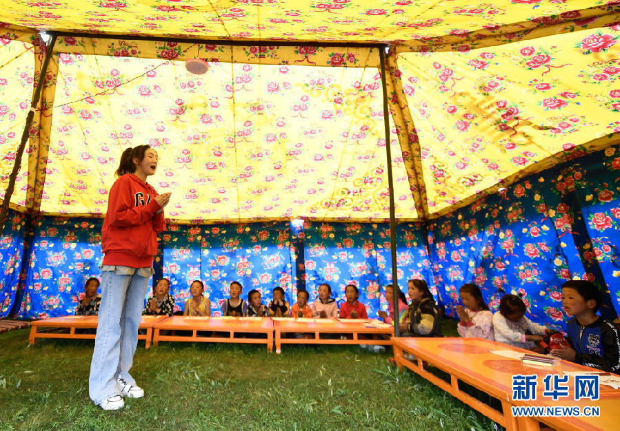 8月2日,在青海省果洛藏族自治州瑪沁縣下大武鄉(xiāng)年扎村“育苗加油站”的帳篷里,大學生鬧日卓瑪在教孩子們唱歌。新華社記者 張龍 攝