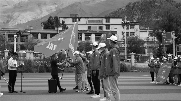 共青團(tuán)西藏自治區(qū)委員會副書記何華向各市地志愿者隊(duì)伍授旗。圖由團(tuán)區(qū)委提供