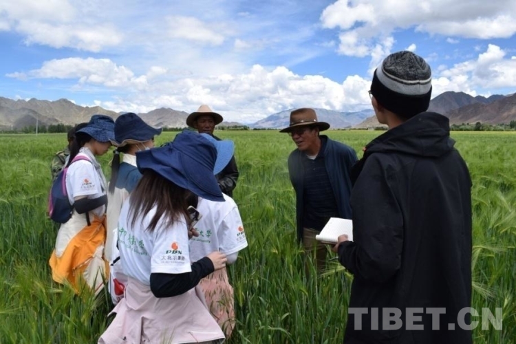 圖為中國農(nóng)業(yè)大學(xué)人文科考隊(duì)在青稞田里了解情況