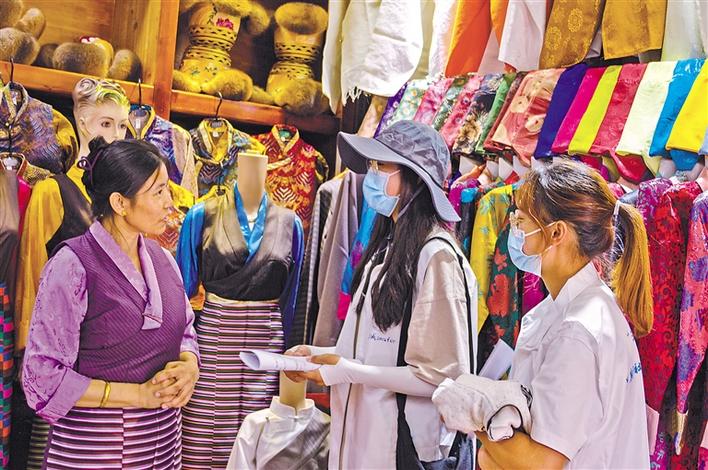 圖為實(shí)踐隊(duì)在拉薩八廓街古城朵究蒼藏裝店,了解藏裝的面料、穿法等情況。易祥瑞 攝